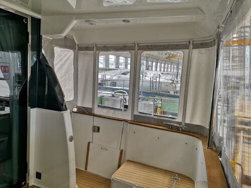 Zusätzliche Luken, Schiebefenster Backbord, blickdichte Vorhänge, Fliegengitter, Handläufe beidseitig im Niedergang, LED-Vollausstattung, Suchscheinwerfer mit Fernbedienung, zusätzliche Klampen, Scheuerleisten – alles durchdacht, alles hochwertig.