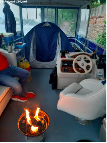 WC Chemie, Geschwindigkeitsanzeige, Sprayhood, Anker, Ankerkette Edelstahl, Batterie, Anker mit Kette, Badeleiter, Radio, Kapitänssitz drehbar und 3 Sofas mit Lederbezügen, inkl. Trailer gebremst neu, Hecktür bzw. Bb. zur Badeleiter, Radio- CD-Player,mit AUX Anschluss für externe Medien.