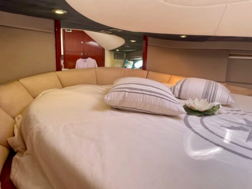 Ein besonderes Highlight dieser Fairline Squadron 52 ist die großzügige Flybridge. Sie bietet einen zweiten Steuerstand, komfortable Sitzmöglichkeiten, großzügige Liegeflächen und einen Grillbereich – ideal für entspannte Stunden an Bord, gesellige Abende im Hafen oder unvergessliche Ausfahrten bei Sonnenschein.