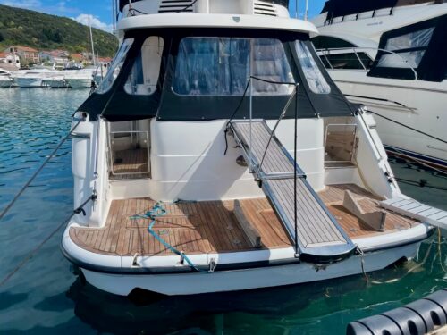 Auch die Außenbereiche sind hochwertig ausgestattet und unterstreichen den eleganten Charakter der Yacht. Das verlegte Teak auf Flybridge, Cockpit, Badeplattform und seitlichen Gangboards verleiht dem Schiff eine besonders wertige und gepflegte Ausstrahlung.